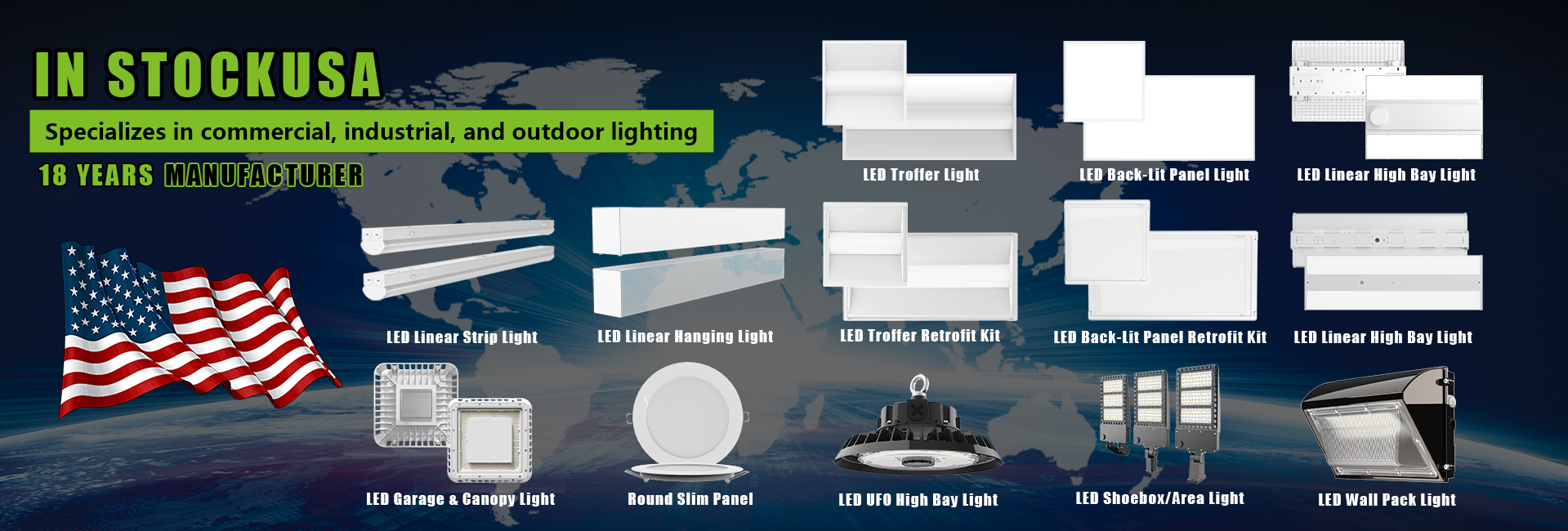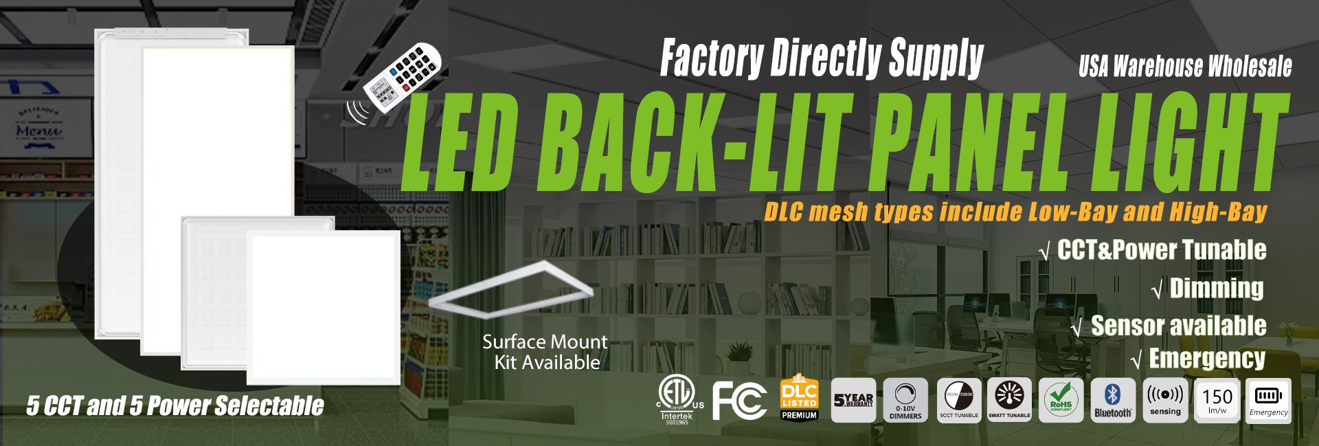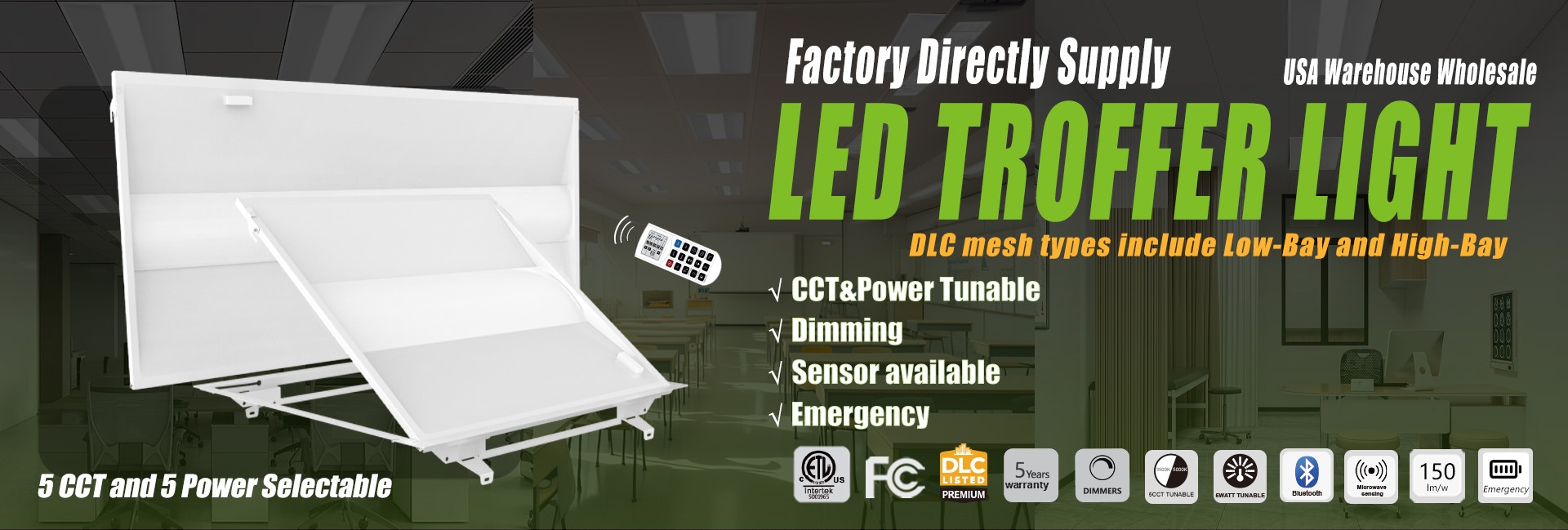 Productos principales:Bahía alta lineal LED, luz de área LED, luz de panel LED, luz LED Troffer, tira de luz LED